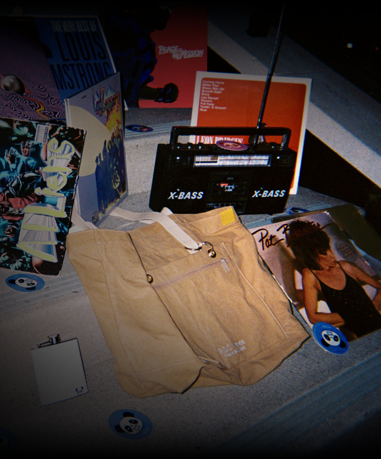 Large boat shrunk canvas tote with a detachable outer pouch to fit everything from boomboxes, vinyl records, extra plush beach towels, etc. Material nearly indestructible. Made from reclaimed surplus materials in Los Angeles, USA.